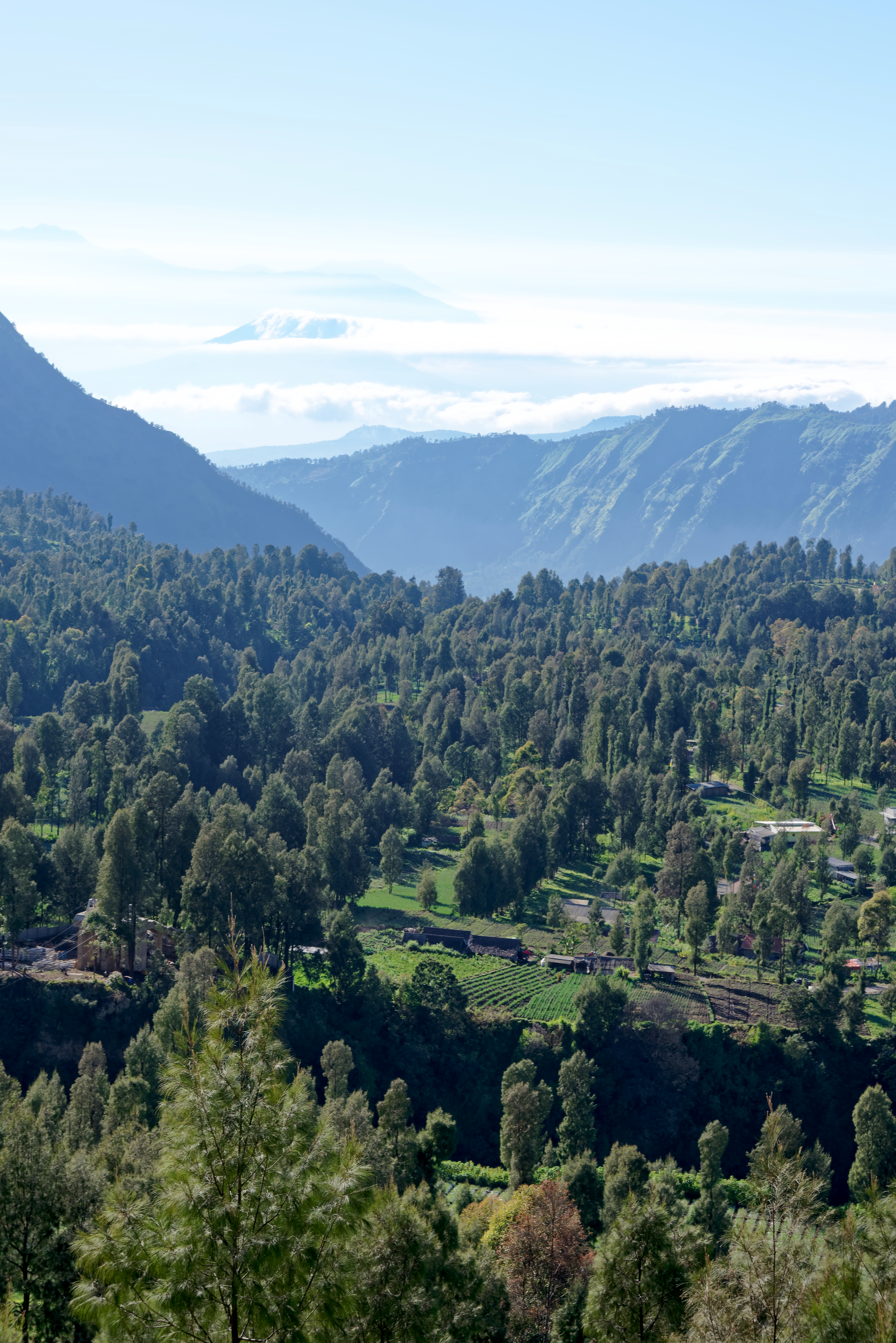Pola wioski Ngadisari we Wschodniej Jawie - widok z punktu obserwacyjnego na wulkan Bromo