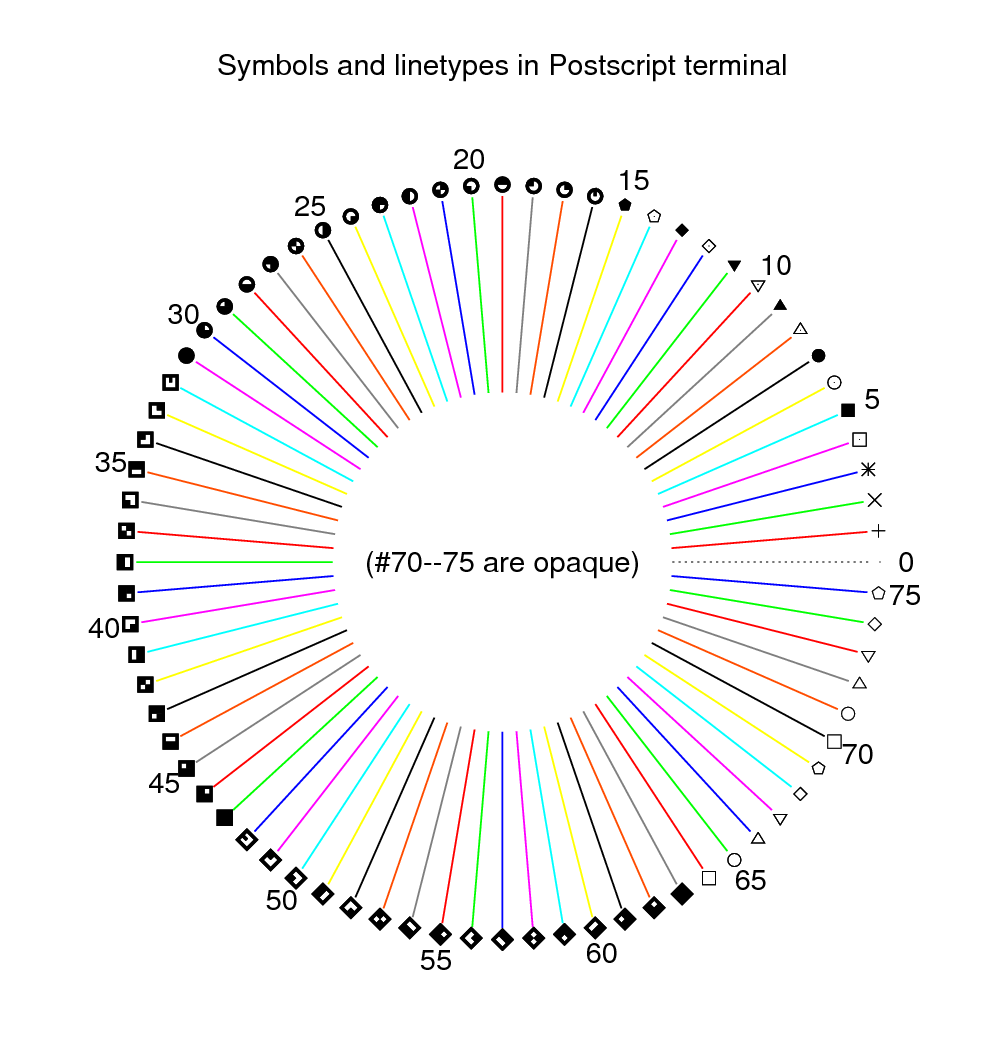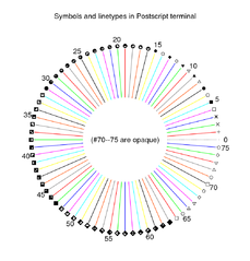 [edit]| DescriptionPs symbols color solid.png | gnuplot line and point styles in color solid postscript terminal |