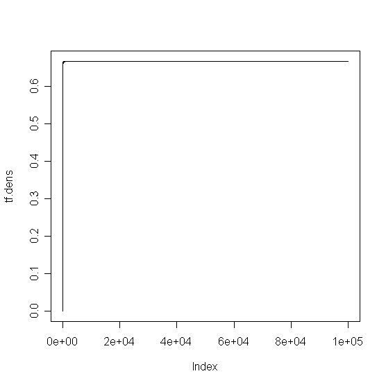 [edit]| DescriptionTriang free density.png | The density of "triangular free" numbers (i.e. those whose factors, other than 1, are not triangular numbers), less than 100000. Generated in R version 2.4.1. |