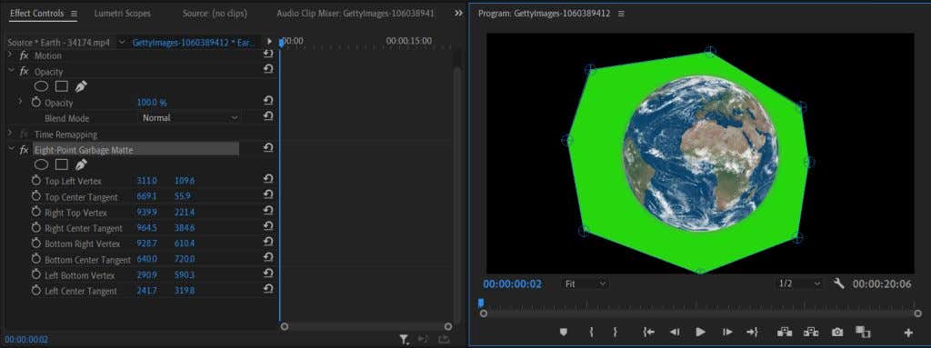 1. After placing your green screen footage in your timeline, open the effects panel and go to Video Effects > Obsolete. From here choose the Eight-Point Garbage Matte if you have a simpler subject as your green screen foreground. Choose the Sixteen-Point if your subject is more intricate. Below I’m using an eight-point garbage matte since the subject is just a circle.