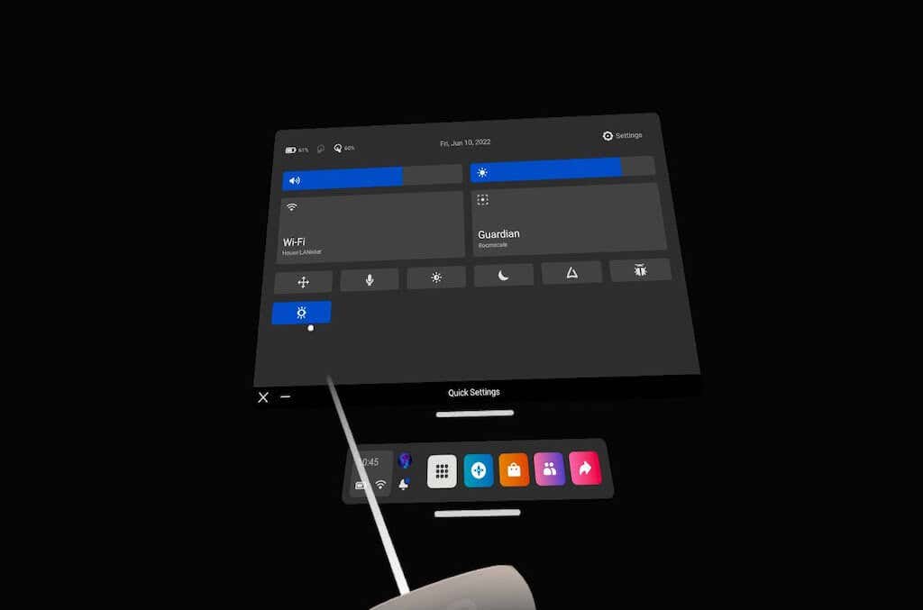 - Press the Oculus button on your right touch controller to bring up the quick menu, then select the Quick Settings icon in the lower-left corner.