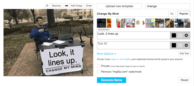 Meme Generator is probably the easiest tool on the internet to use. It provides access to the most popular memes and automatically positions the text. For example, the “Change my Mind” meme will automatically position any text on the sign. Even after the text has been entered, you can reposition it within the image.