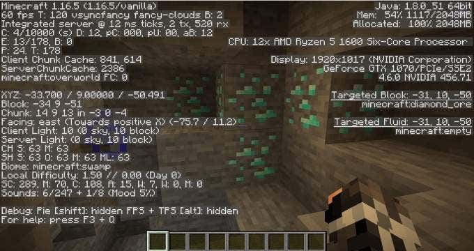 • If you aren’t sure what level you’re on, press F3 to open the debug menu. It shows you your exact location through X/Y/Z coordinates. The Y coordinate is your altitude. You’ll find diamonds when you’re below level 16.