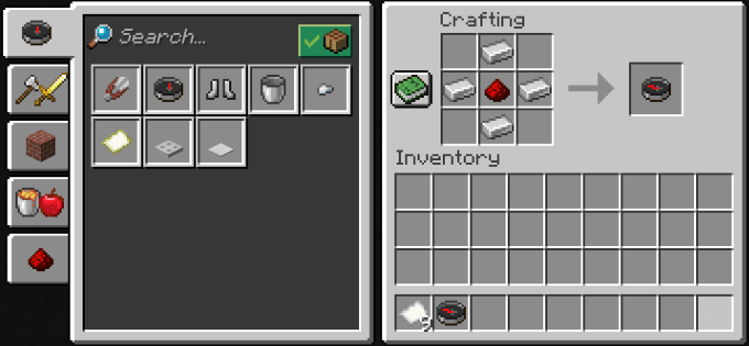 Place the four iron ingots in the north, west, south, and east blocks of the crafting table and place the redstone in the center. This yields a compass.