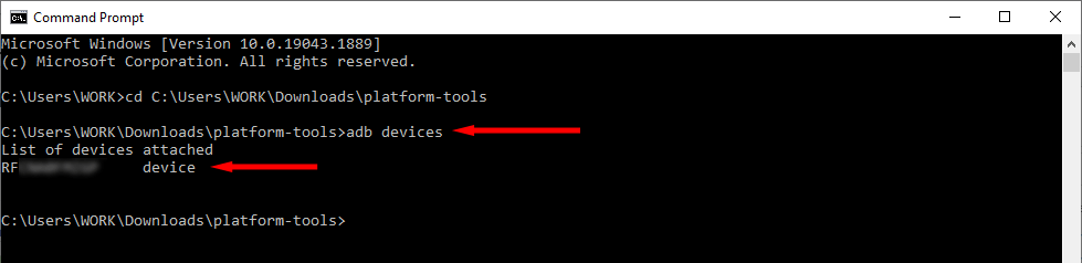 1. Type “adb devices” and press enter to double-check that the ADB program has recognized your Android device. If recognized, it will display your Android’s serial number. If not, try reconnecting the charger.