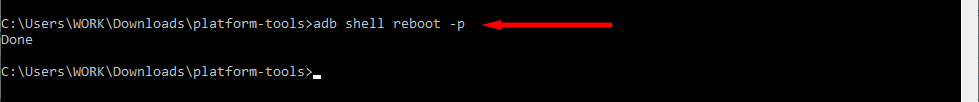 1. Type “adb shell reboot -p” and press enter. For Terminal, type “.\adb shell reboot -p” and press Enter.