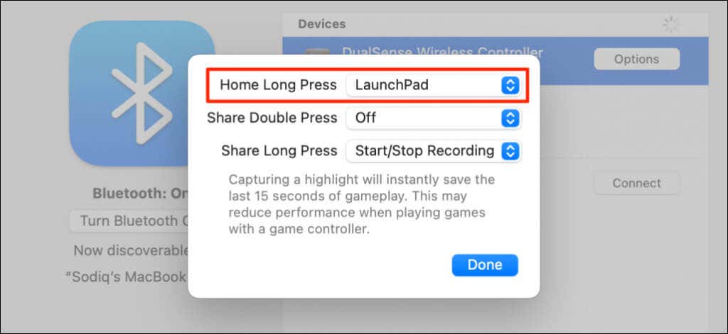 1. You can configure macOS to open the floating app switcher when you long-press your controller’s Home (PS) button. To do so, open the “Home Long Press” drop-down menu and select LaunchPad.