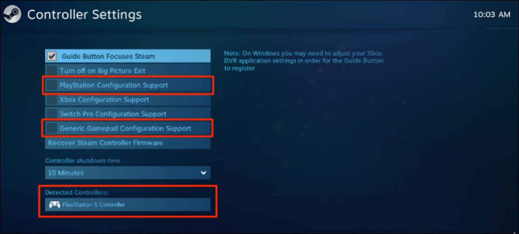 1. Ensure your PlayStation 5 Controller appears in the “Detected Controller” section. Select the PlayStation Configuration Support checkbox and close the controller settings window.