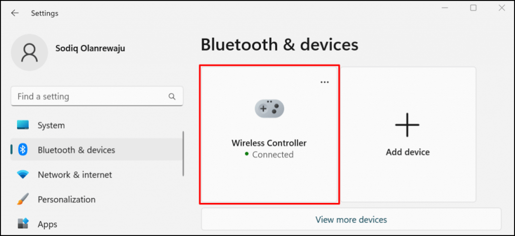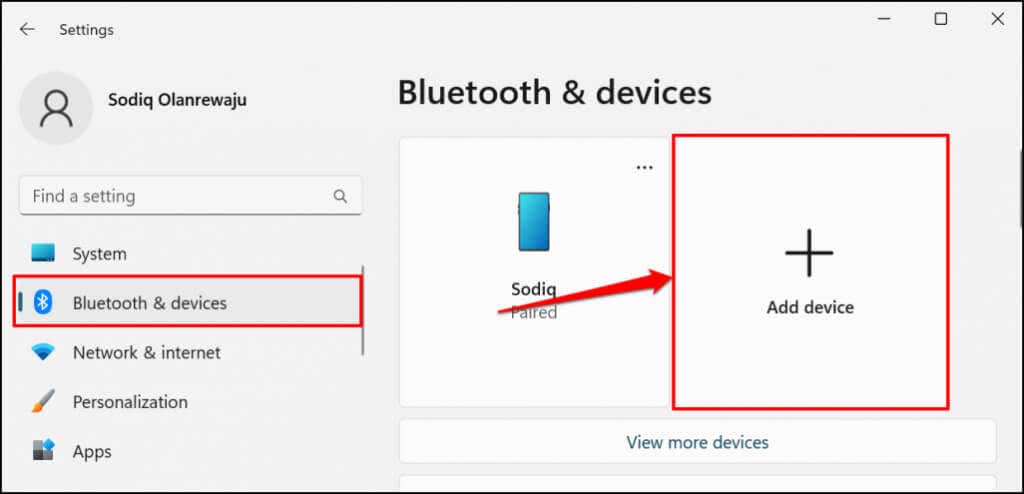 1. On Windows 11, open your PC’s Settings app (press Windows key + I). Select Bluetooth & devices on the sidebar and then select Add device on the right.