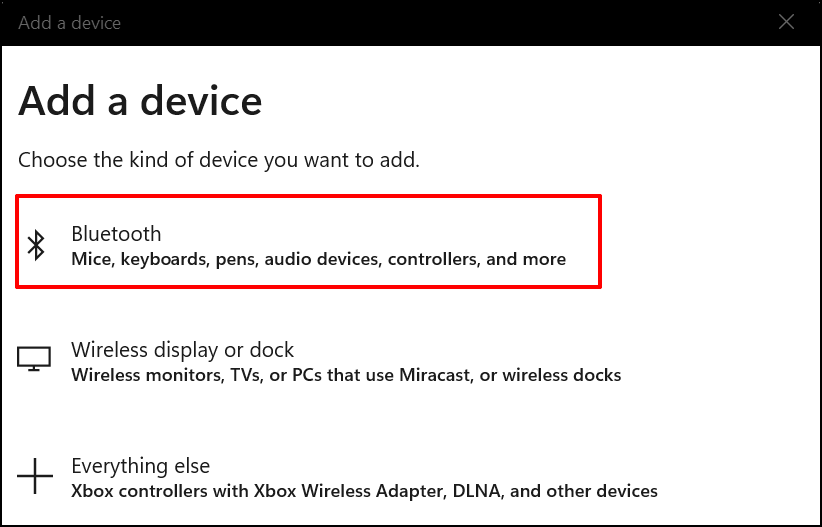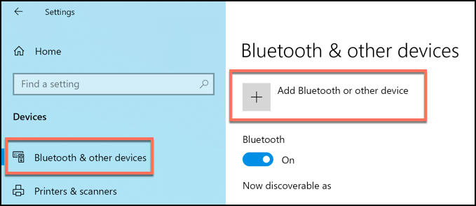 On Windows 10, go to Settings > Devices > Bluetooth & other devices and select Add Bluetooth or other devices.