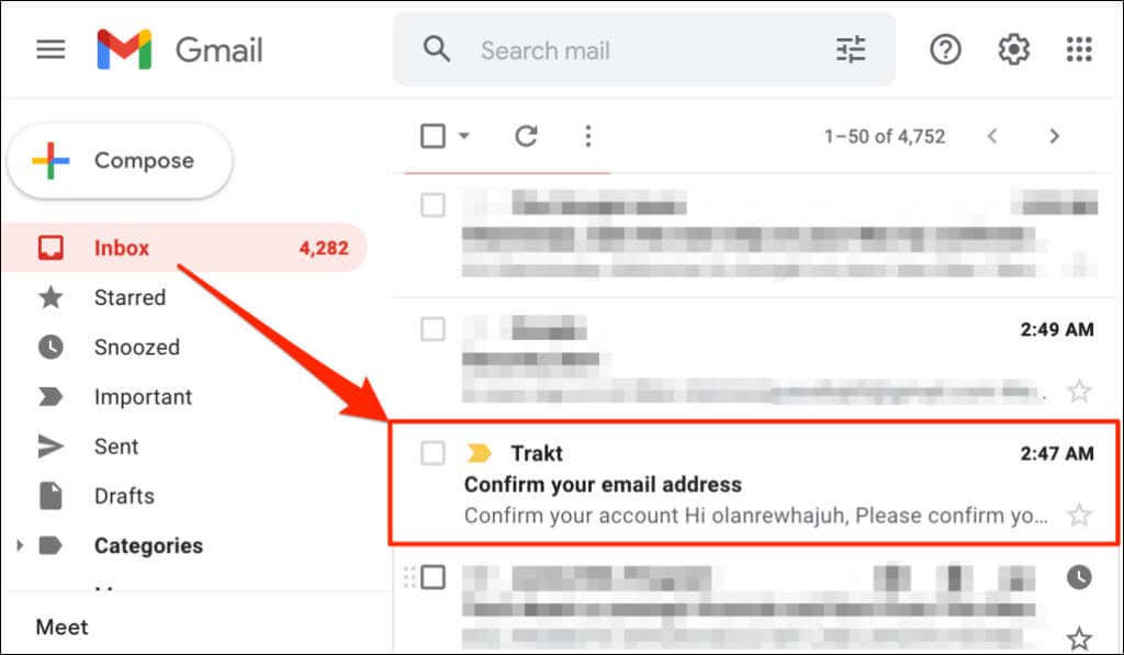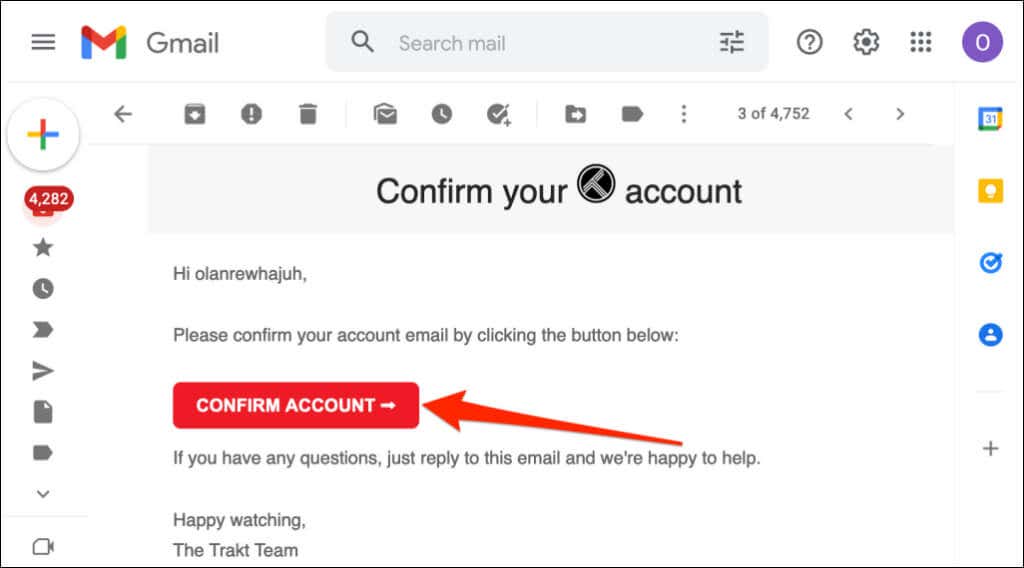 1. Trakt will send a verification message to your email address. Open your inbox (or spam folder) and open the email from Trakt with a “Confirm your email address” subject.