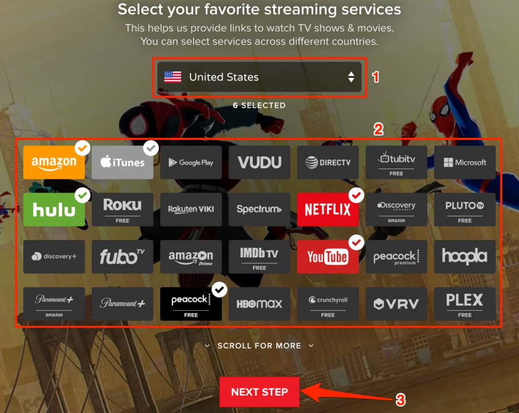 1. Select your country and the streaming services you use. Select Next Step to proceed.