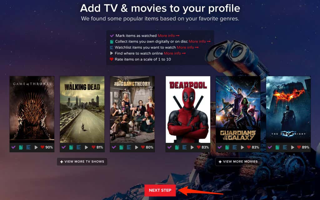 1. Select movies/shows you’ve watched and items you own—digitally or on disc. You can also add content to your watchlist (i.e., shows you want to watch). Select Next Step to continue.