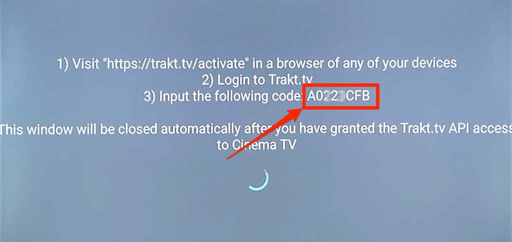 1. Wait for the add-on to load the account authorization page and enter the code on the Trakt TV website—see step #6.