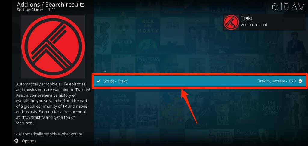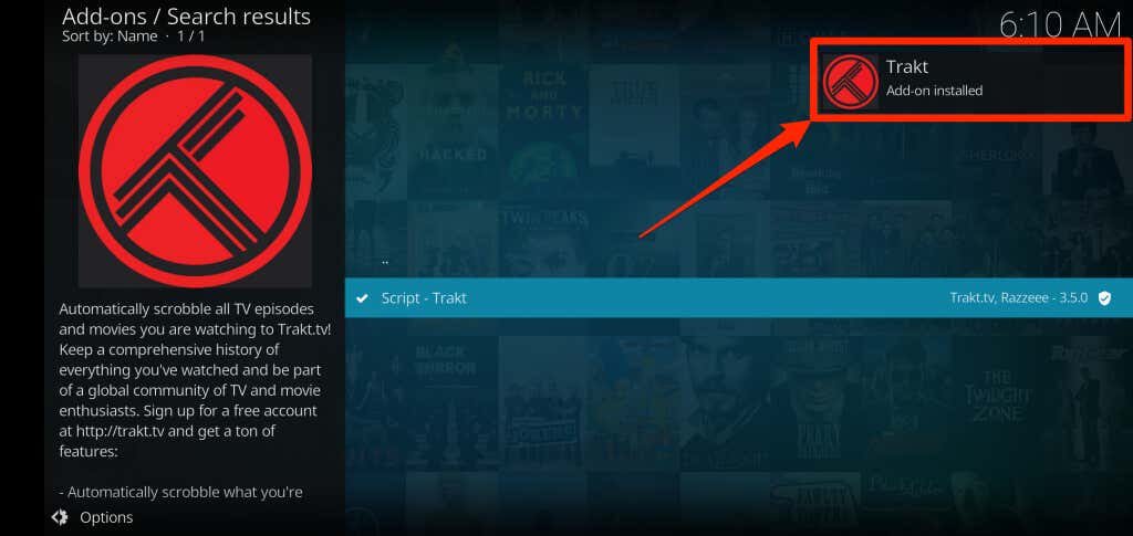 Wait for the app to install Trakt TV from the Kodi add-on repository. Look out for an “Add-on enabled” alert in the app’s top-right corner.