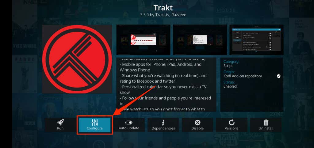 1. Open the Kodi Settings menu, go to Add-ons > My add-ons > All > Trakt, and select Configure.
