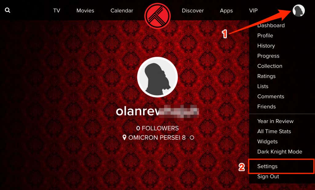 1. Log in to your Trakt account on a web browser, tap your profile icon, and select Settings.