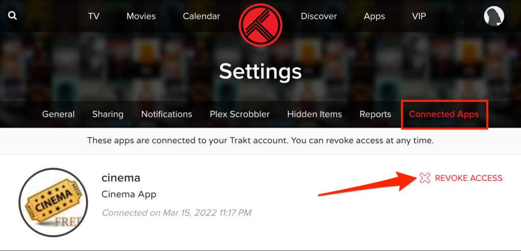 1. Head to the Connected Apps section to view all apps authorized to access your Trakt account.