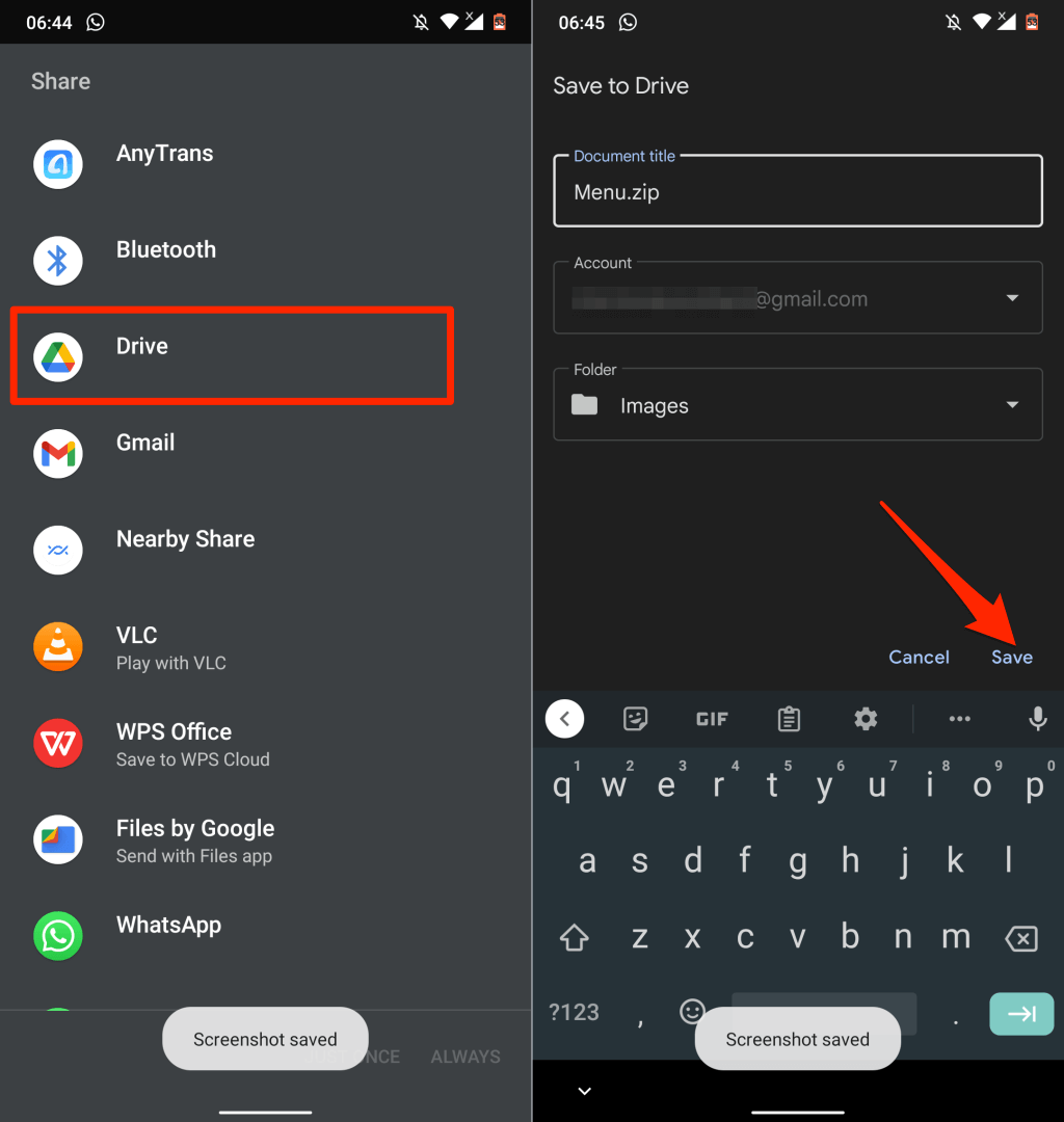 - Select Drive in the share menu to upload the zipped image file to your Google Drive account.