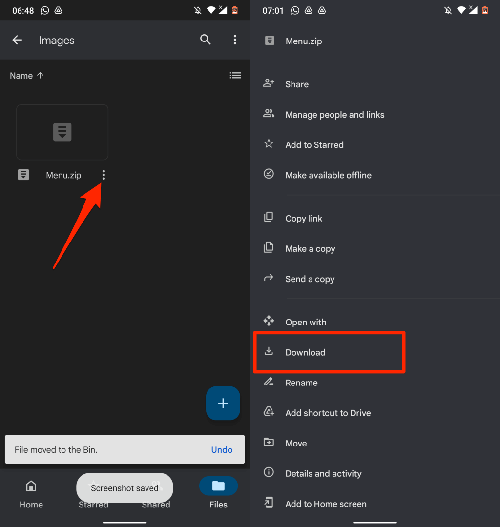 - When the upload is complete, locate the file in your Drive account, tap the menu icon, and select Download.