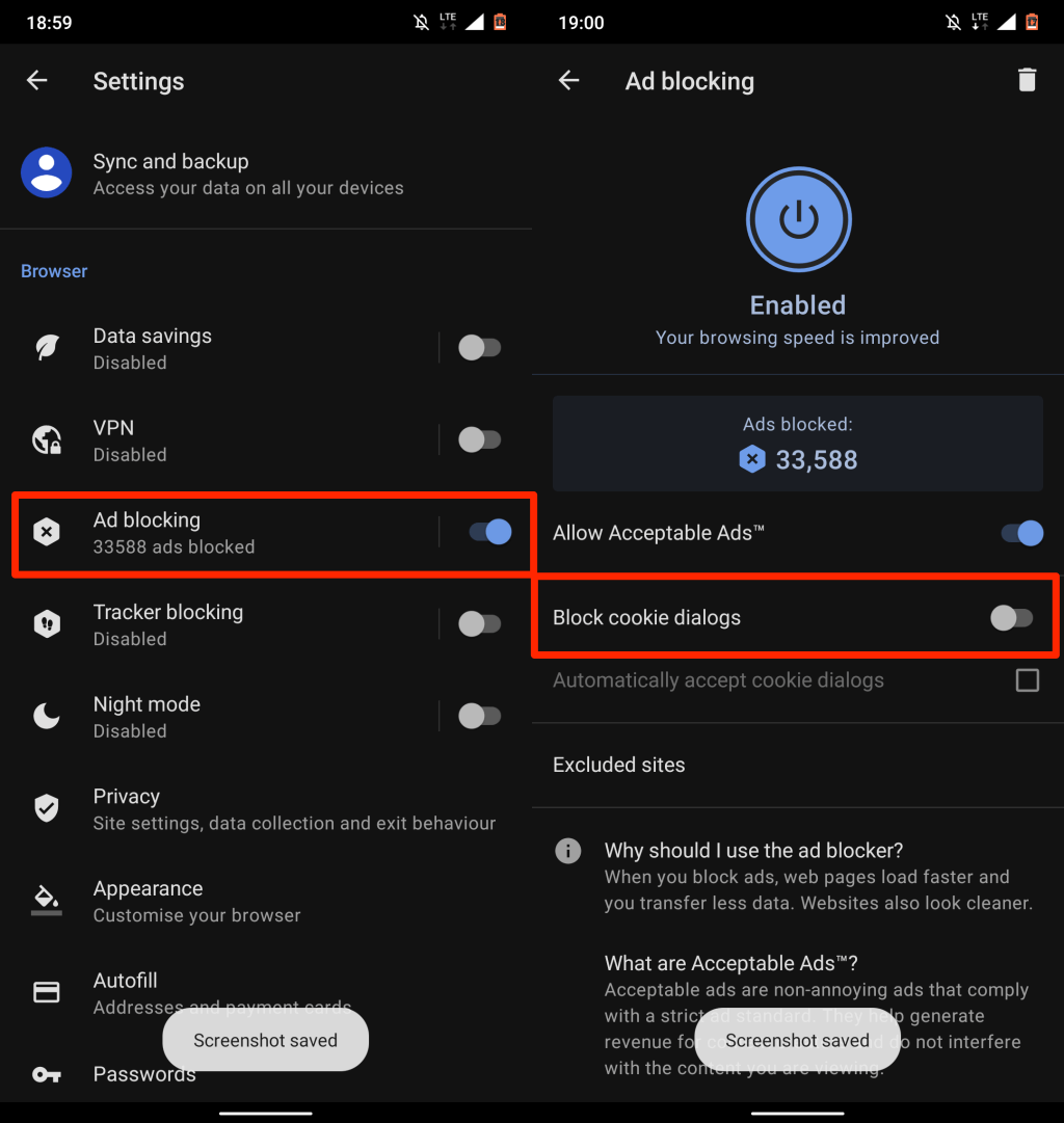 If you find the “Accept cookies” pop-ups on many websites annoying, you can also turn them off. Open the Settings menu, select Ad blocking, and choose if you want to “Allow Acceptable Ads” or “Block cookie dialogs.”