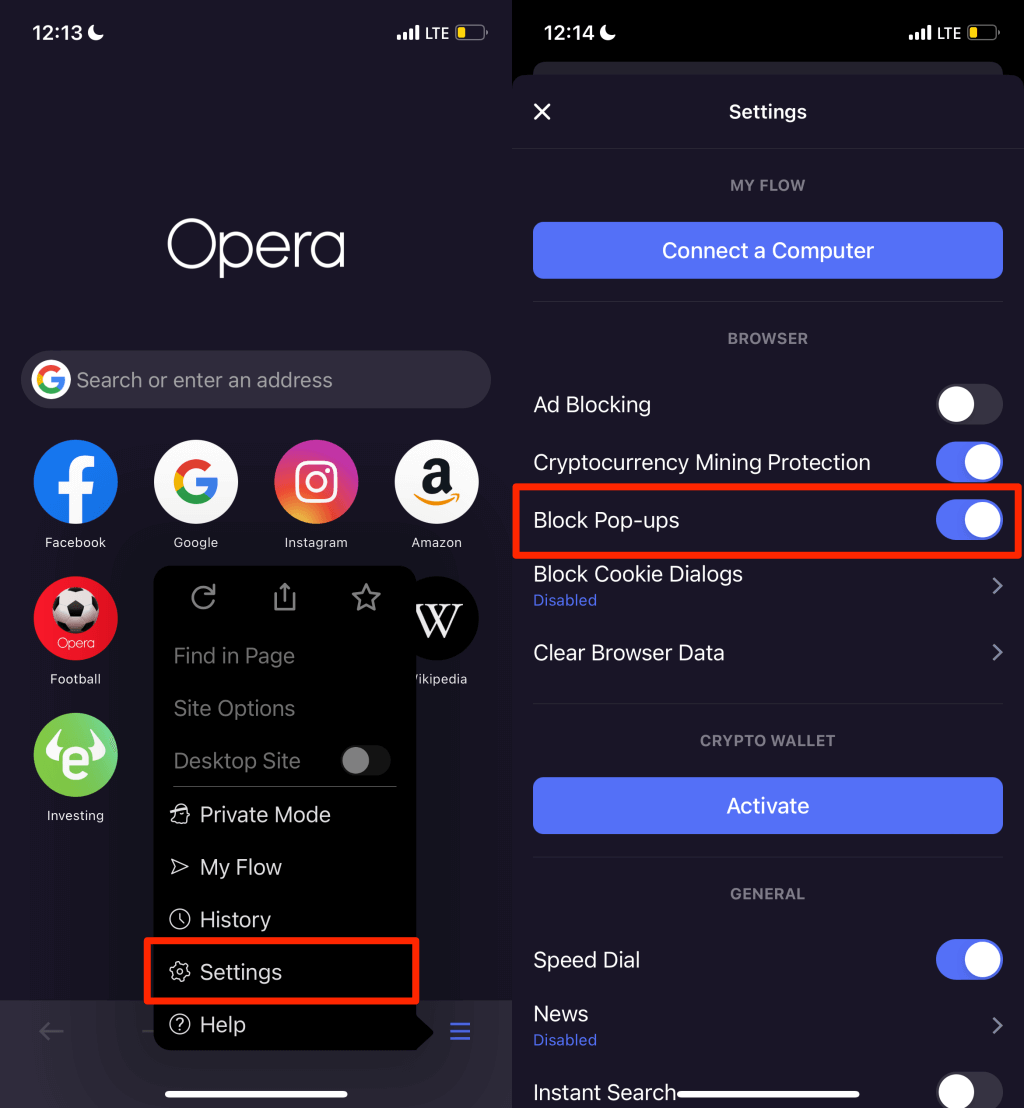 Open Opera, tap the hamburger menu icon in the bottom-left corner, select Settings, and toggle on Block Pop-ups.