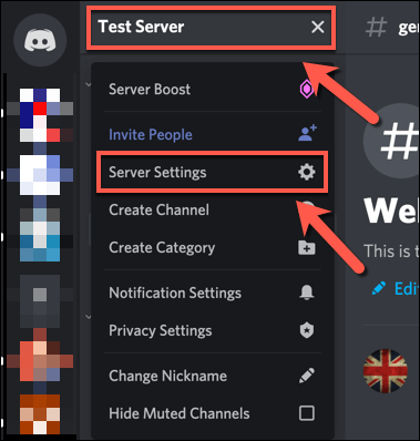 - To start, open the Discord website or desktop client and sign in, then select your server from the server icons on the left. Select your server name at the top of the channel list, then select Server Settings from the drop-down menu.