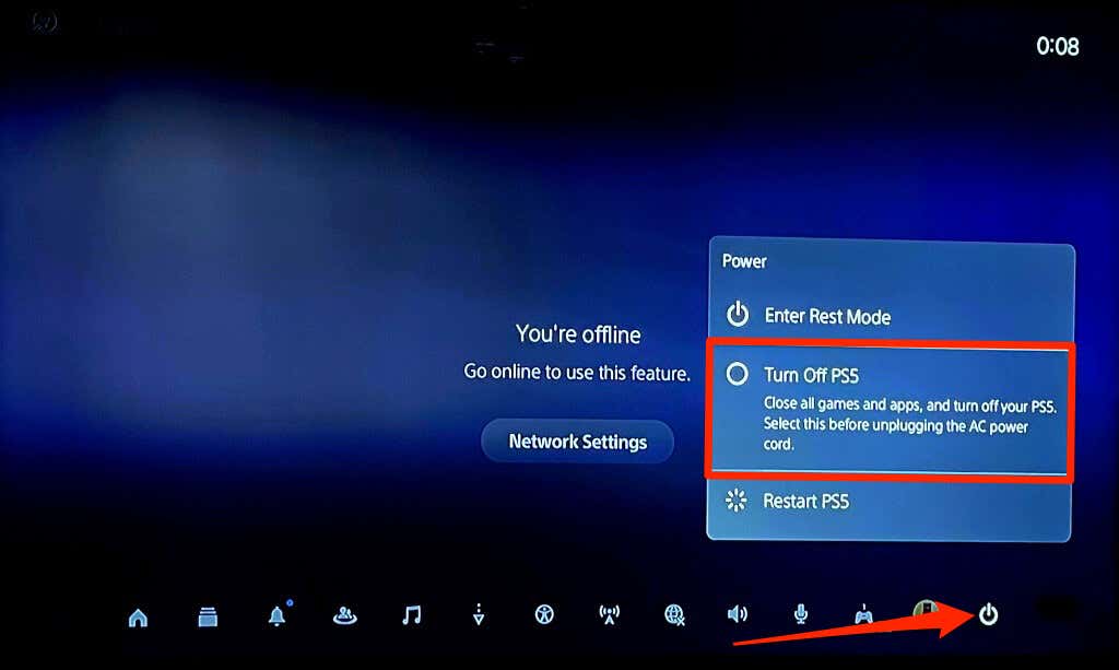 Avoid shutting down your PS5 by unplugging its power cable or turning off the wall outlet/socket. Doing so might corrupt system files or brick your PS5. Instead, turn off your PS5 from the power menu or use the physical power button before unplugging the AC power cord.