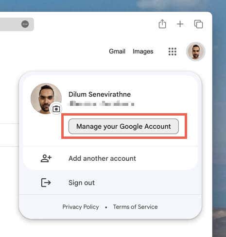 1. Open a web browser, visit the Google Account Sign-In page, and log into your Google Account. If you’re already signed into a Google service (e.g., Gmail, Search, or Photos), select your profile picture icon on the top right of the web page and choose Manage your Google Account.