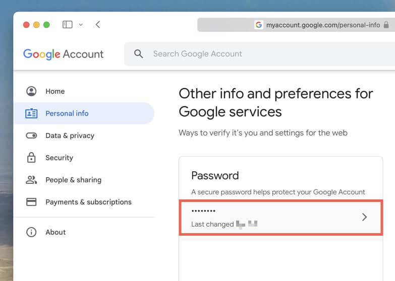 1. Select Personal info on the Google Account settings sidebar, and then scroll down to the Other info and preferences for Google services section and choose Password.