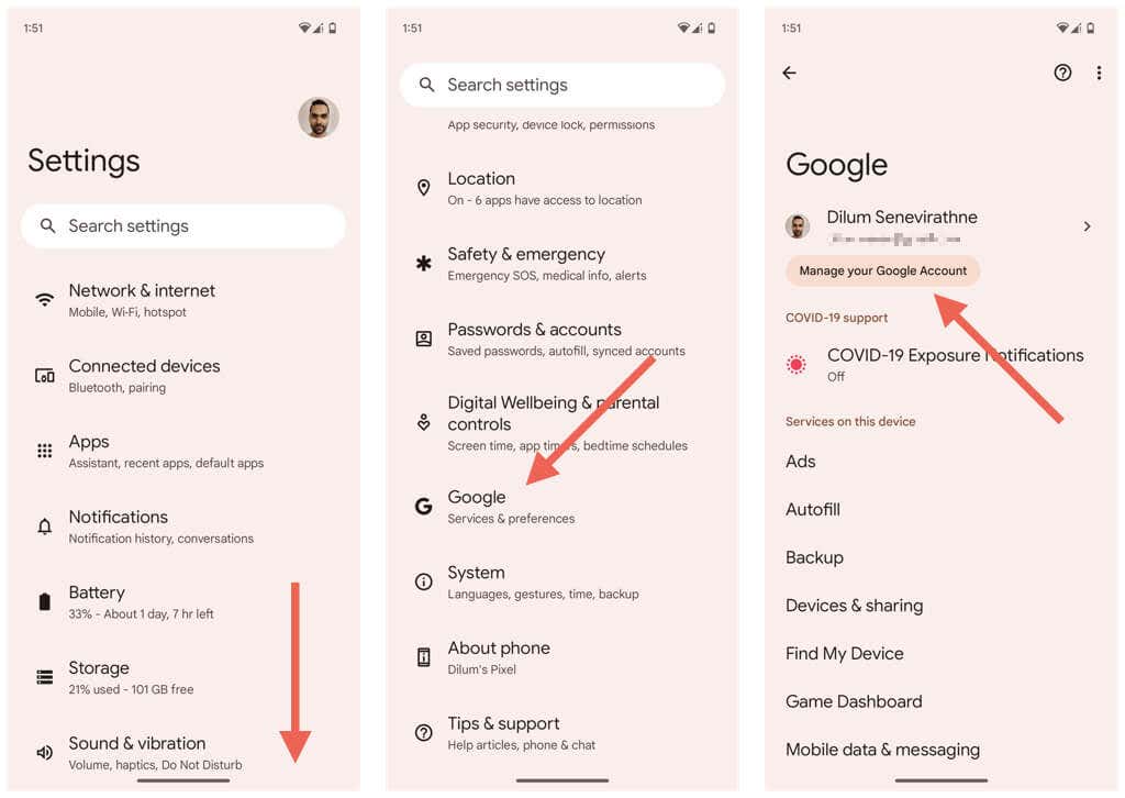 You can change the Google Account password through the device settings on an Android phone. Here’s how: