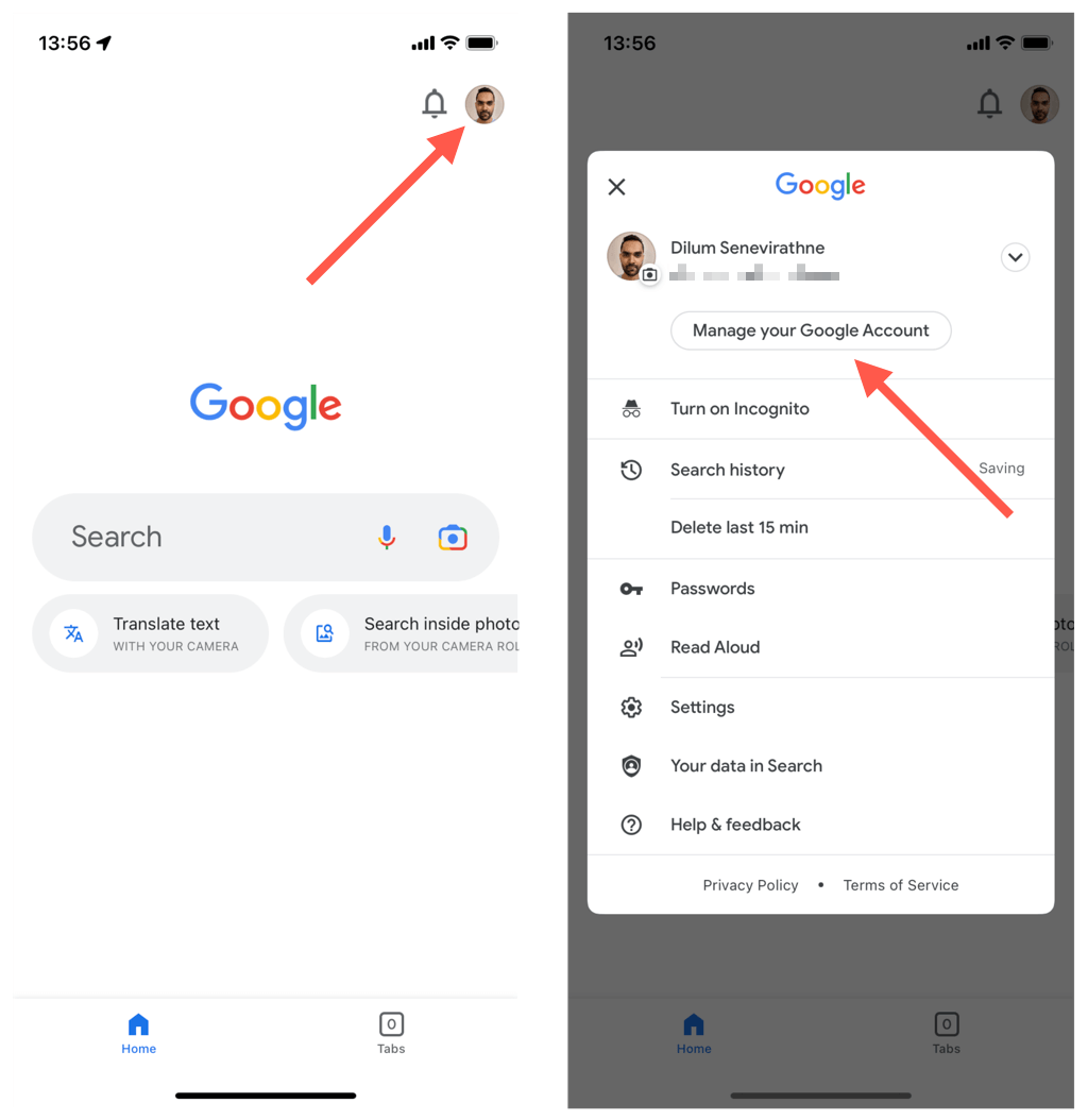 On iOS devices, you can change the Google Account password through Google apps like Gmail, Google Photos, and Chrome. To do that: