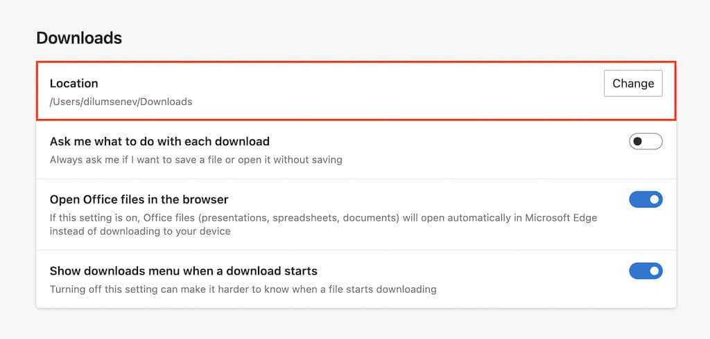 Re-open the Settings page in Edge and select Downloads on the sidebar. Then, select Change next to Location to switch download directories.