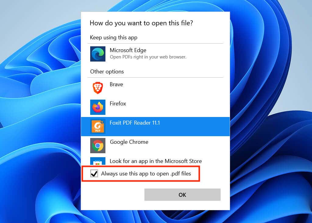 3. Check the box next to Always use this app to open .pdf files and select OK.