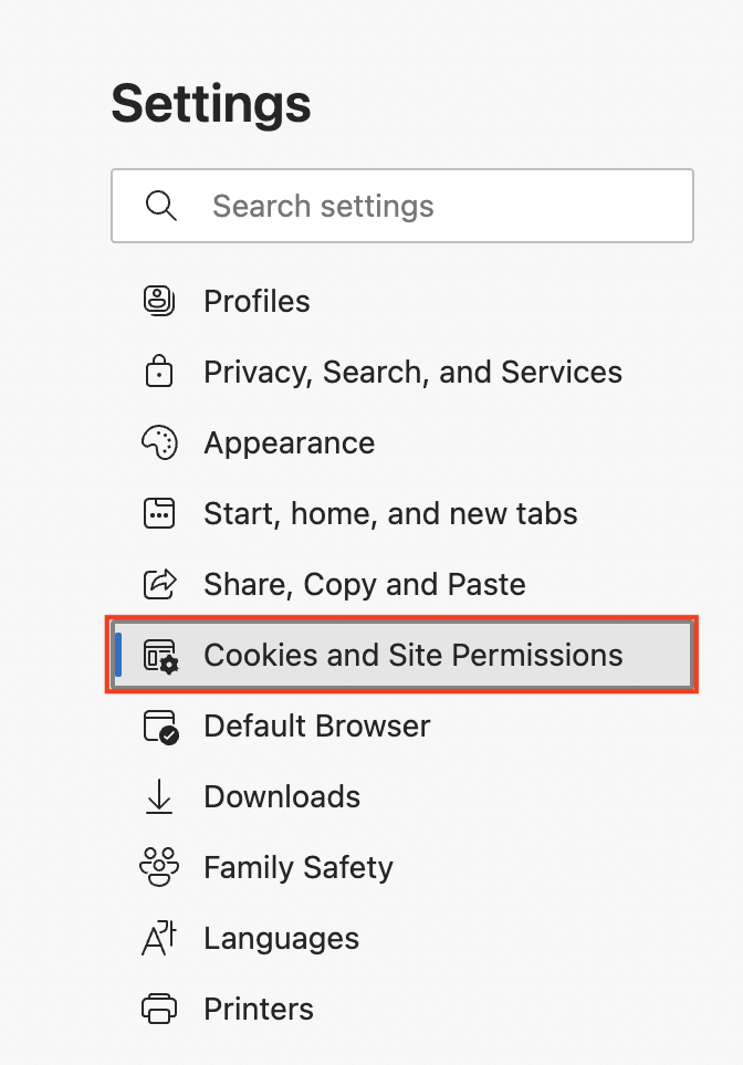 2. Select Cookies and Site Permissions on the sidebar.