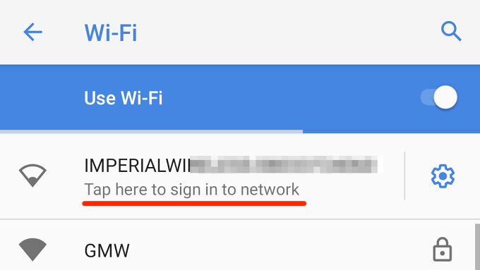 When connected to this type of network, the Wi-Fi icon in your device’s Status Bar will be canceled out. Your device should also display a notification prompting you to sign in. Tap the notification and follow the instructions on the resulting web page to access the internet on the network. Complete the required task or contact the network administrator for the login credentials.