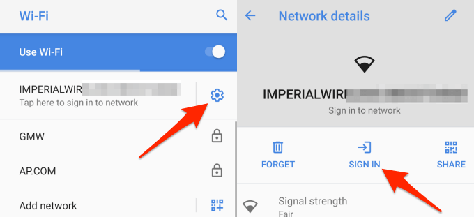 Alternatively, tap the gear icon next to the Wi-Fi network and tap Sign In.