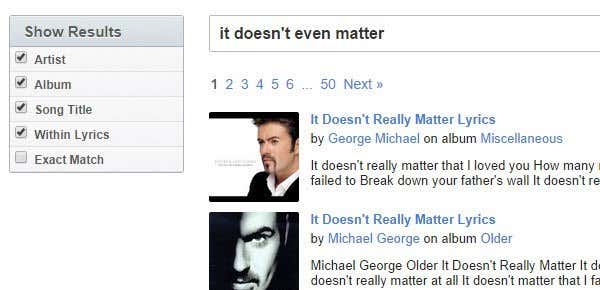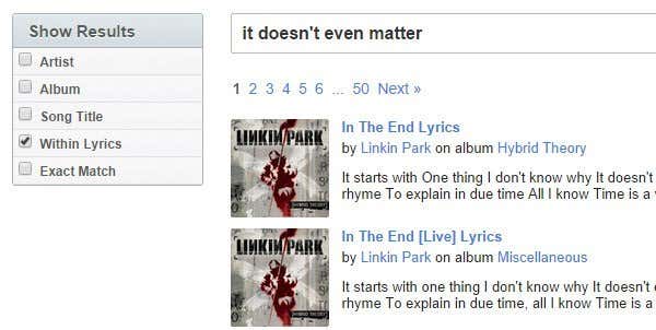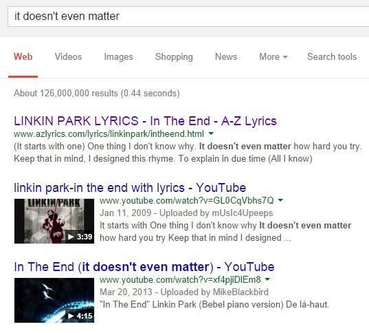 If you can remember a line or two from the song, probably just performing a simple Google search will bring up all the info you need without having to go to a lyrics search site. A simple search like “it doesn’t even matter” on Google will give you the correct band, Linkin Park and the correct song title, In the End.