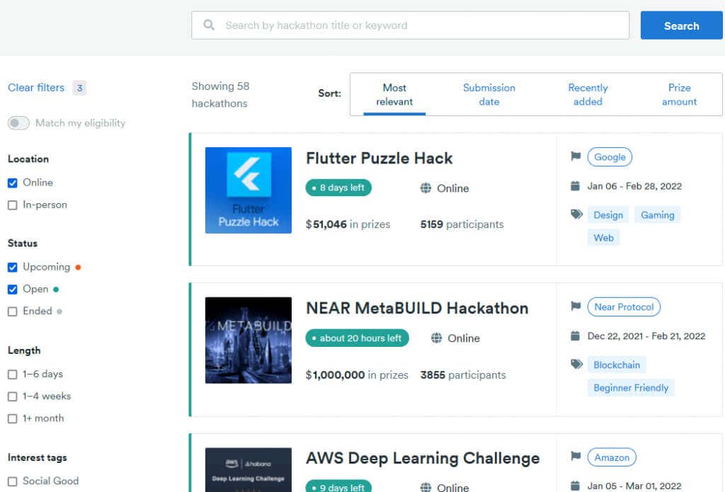 Many organizers use Devpost to host their virtual hackathons. The platform is easy to use because of its excellent search system, where you can view upcoming events and filter them by online/in-person, interest, and host. There were nearly 60 active or upcoming hackathons when writing this article, and at least one of them offered $1 million in prizes.