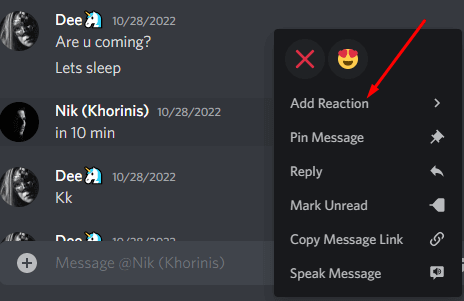 Another option is to right-click the message you want to react to and select Add Reaction from a drop-down menu.