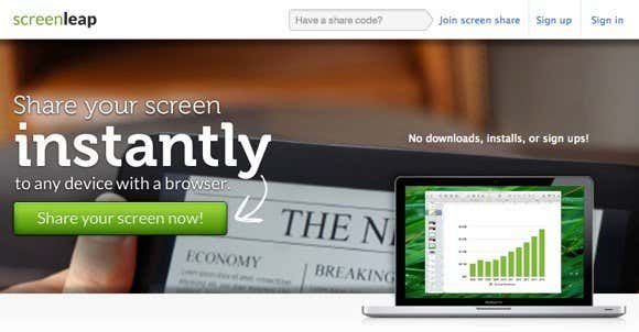 ScreenLeap is a newer service for sharing your screen for free. Their whole selling point is one-click sharing, which works well if you have Java enabled. It takes about 20 seconds to load and then you’re good to go. You get a code, give that code to someone else who can view your screen from a desktop, a tablet or even a smartphone. That’s pretty neat and convenient since a lot of people use their tablets and phones more than their computers.