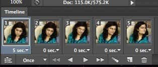 When you do this, you’ll now see only one image in the timeline with a small little 1 in the top left corner. It will either be the image you have selected in the Layers panel or it’ll be the most recently added layer (last image in the animation). At this point, it’s a one frame animation, which is not what we want.