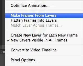 Instead, we want all the layers to be included in the animation. In order to do this, we have to click on the tiny little down arrow button at the far right of the Timeline window. It’s got a small down arrow and then a couple of horizontal lines next to it. when you click on that, you’ll see an option called Make Frames From Layers.