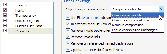 Finally, the Clean Up tab does a few more housekeeping tasks like compressing the entire file and optimizing the PDF for fast web view.