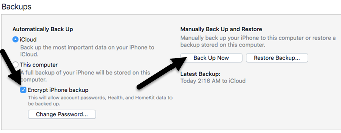 In my case, iCloud is where my phone gets backed up to automatically. I highly recommend using both iCloud and local backups as an extra safety net. First, check theĀ Encrypt iPhone backup box and choose a password to secure the backup with. Make sure you keep the password safely because you’ll need it in order to restore the backup.