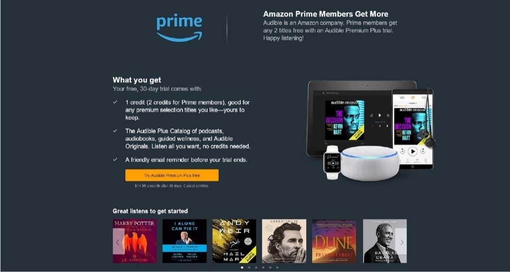 Amazon offers a free 30-day trial of Audible that includes 1 free audiobook credit (or 2 if you’re also an Amazon Prime member). This is a great way to determine whether Audible is for you and learn how it works (and get a free audiobook or two).