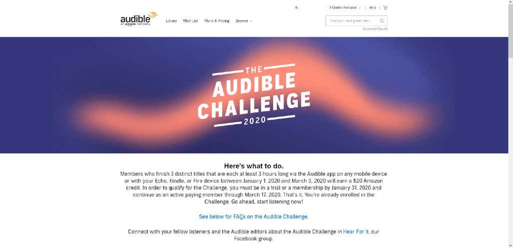 Audible occasionally runs challenges for their subscribers. In 2020, they ran the Audible Challenge which granted a $20 Amazon credit to any user who finished 3 audiobooks of at least 3-hour length.