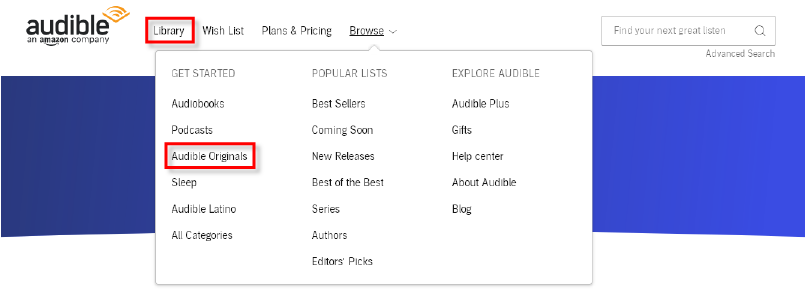 Audible offers a large collection of free audiobooks. These are located under Amazon Originals, which can be found by clicking on Browse and then Amazon Originals.