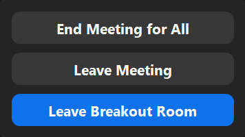 - Alternatively, you can select the Leave Room button and then choose Leave Breakout Room to be placed back in the main meeting.