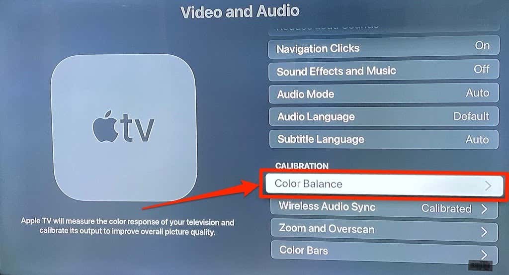 1. On your Apple TV, head to Settings > Video and Audio, and select Color Balance in the “Calibration” section.